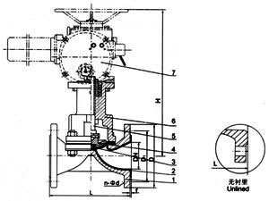 部件列表:1.閥體 2.閥體襯里 3.隔膜 4.閥瓣 5.閥桿 6.閥蓋 7、電動頭